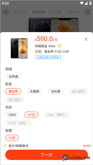 3、选定目标设备后,选择所需规格(存储容量、颜色、租期等)。