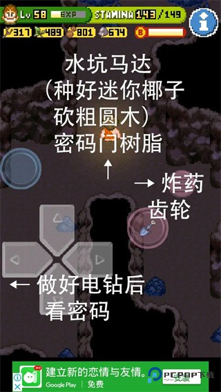 5、中上路线过水坑能拿马达。过水坑前种个迷你椰子树砍倒,弄根粗圆木当船划过去就好。中下区域是道密码门,解开后直奔最右上角石堆,树脂妥妥在那里捡到。