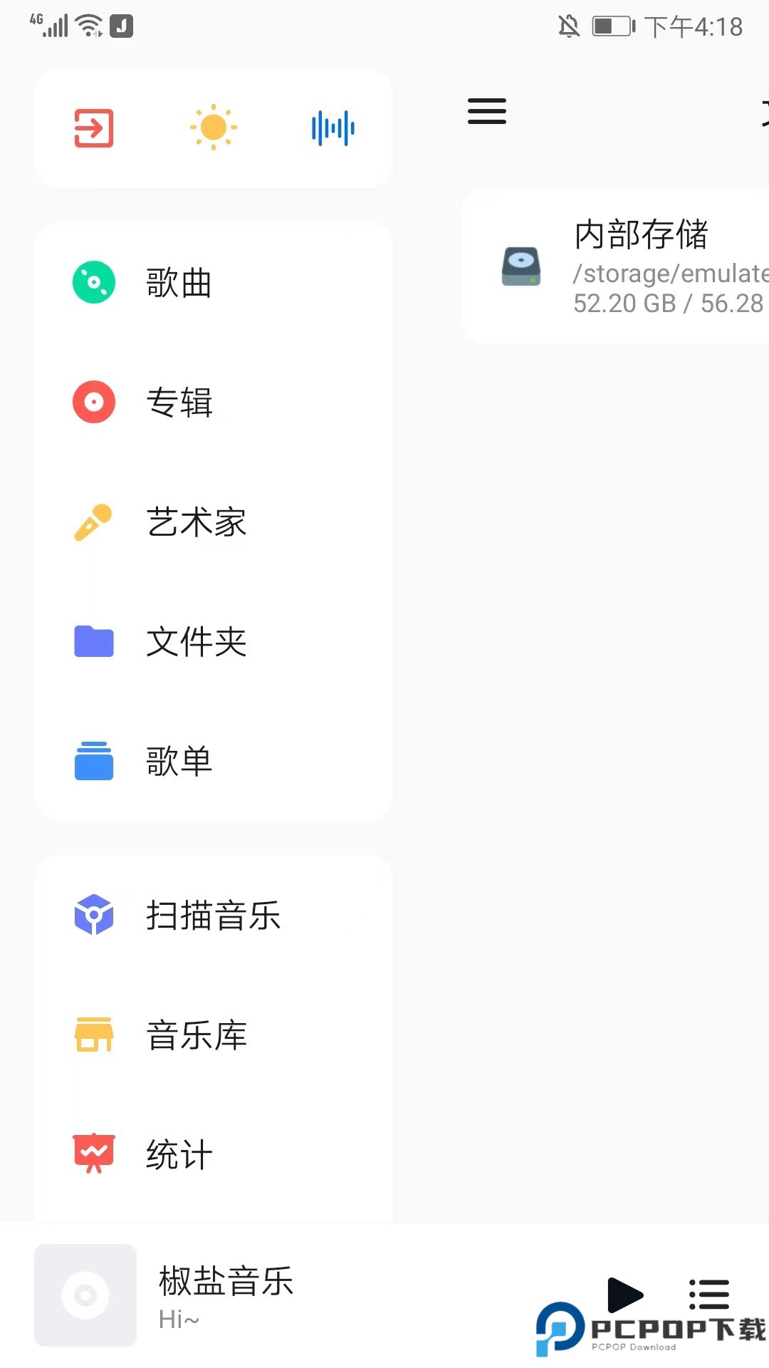 3、进入菜单界面,包括歌曲、专辑、艺术家、文件夹、歌单、扫描音乐、音乐库、统计等功能选项,用户可根据需求选择使用,这里以【歌曲】为例,