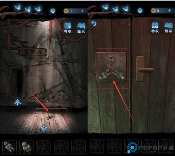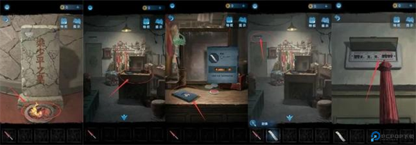 5、点击门板,用朱砂笔将门上的图案一笔连成;进入第三间,点击小木桌,拿到小木棍并获取鼓锣顺序;先将封条放在木箱上,然后点击红布将其拉下;按顺序敲锣打鼓,开启木箱。