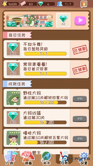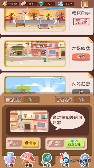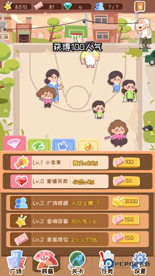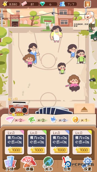 1、广场 - 角色管理与合成区域:此处用于部署角色阵容及消耗“人气”资源招募新角色(大妈)。消耗人气可提升四种达毛的心态与舞力属性。招募两个相同星级角色后,点击右侧箭头可进行合成,提升角色星级。星级越高,角色能力越强。需注意:角色返回“家”状态后,其舞力、心态属性及角色本身将被重置。