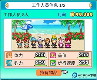 员工一共有四项属性:体力、品位、钓力和步行速度,员工的属性可以通过使用四种卷轴和强化饮料提升(卷轴通过完成顾客目标获得,强化饮料通过商会购买获得),还可以通过钓鱼增加,平时员工在岛屿上工作也有几率提升属性,获得新的员工道具也能提升员工的属性