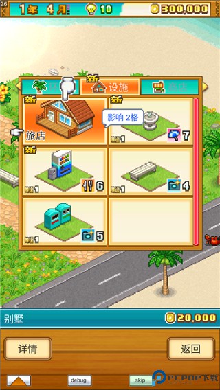 南国度假岛物语采用经典2D像素画风,充满清新自然的度假氛围!在南国度假岛物语下载,玩家将从零开始建设旅店、商铺、娱乐设施等,吸引游客前来度假。南国度假岛物语汉化版通过合理规划道路、设施与景点组合,提升旅店人气与收入!