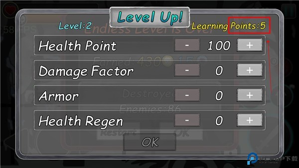 5、等级提升后还可以获得技能点,从上到下分别为:血量、攻击力、防御、恢复。根据自己的喜好来加点。