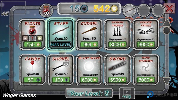 6、通过关卡或失败后就会进行结算,用获得的金币可以在主页的商店中购买各种武器道具。