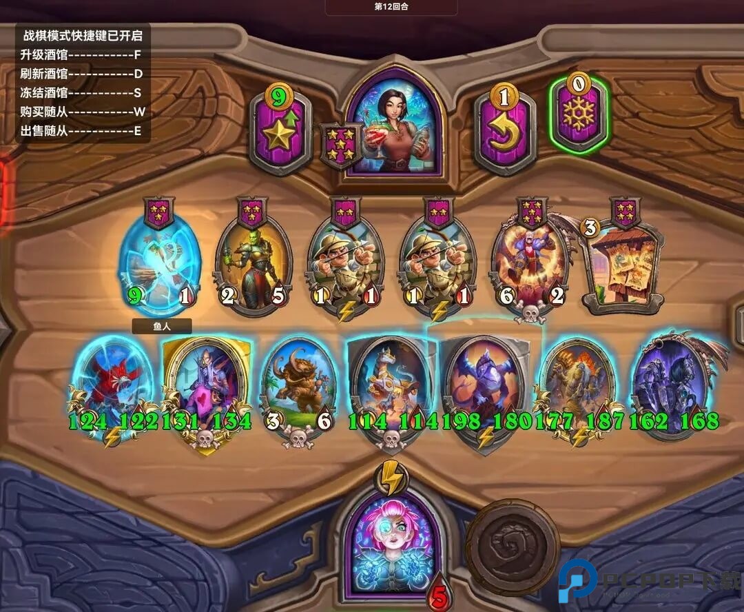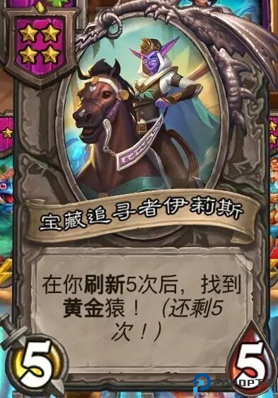 4、第六回合升四本之后,停留找核心卡,正常我们会频繁刷新酒馆,宝藏追寻者伊利斯这张卡遇到小二都建议大家抓。每五次刷新可以拿一个黄金猿去碰瑞文和古墓捣蛋鬼,我这次对局就是迟迟没找到雷鸣憎恶,在四本狂刷靠黄金猿给了两张古墓捣蛋鬼,才5血锁住吃鸡。