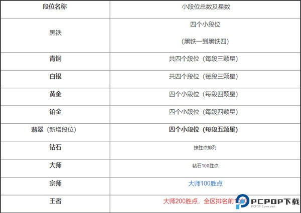 终上所述,手游版本有10个段位,由低到高分别是:黑铁,青铜,白银,黄金,珀金,翡翠,钻石,大师,宗师,王者。其中,翡翠是新增的段位,高于铂金低于钻石。