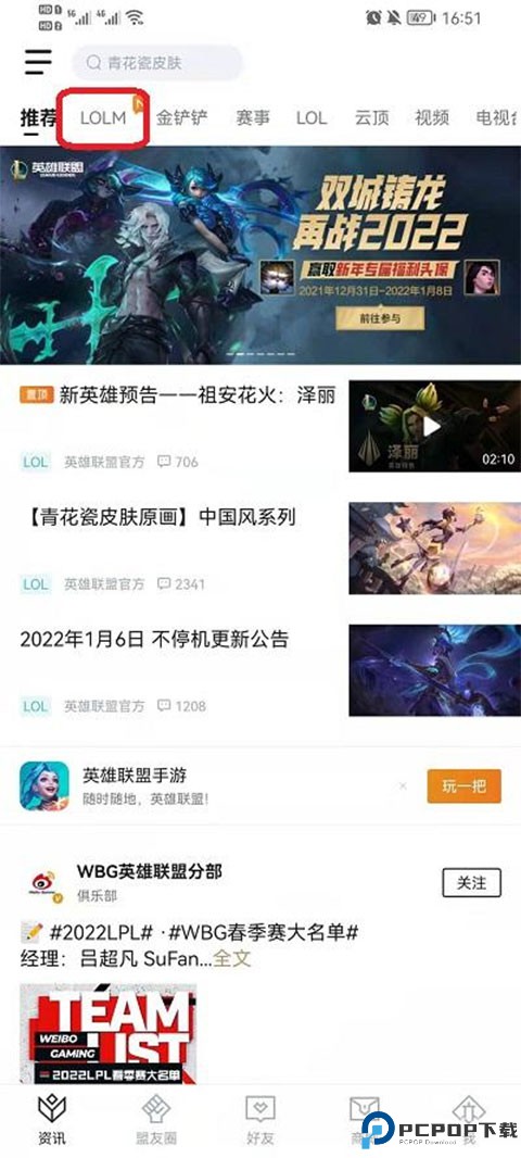 1、玩家还可以通过掌上英雄联盟软件进行申请,首先打开掌上英雄联盟软件,打开软件后点击界面上的【LOLM】选项;