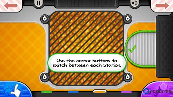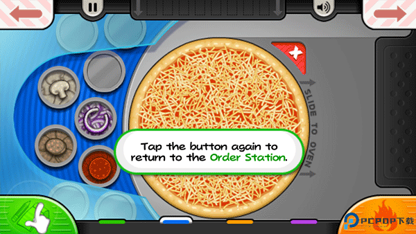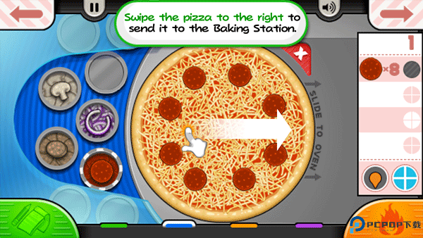 9、烤披萨的时候记得注意火候,当左下角的“火”变成橙色时,就可以将披萨拖至切割站进行切割了。