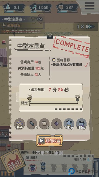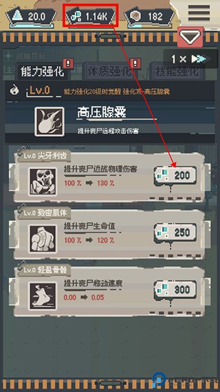 玩家可以点击下方强化图标,使用蓝色能量,强化僵尸,提高它们的伤害、生命值、移动速度。