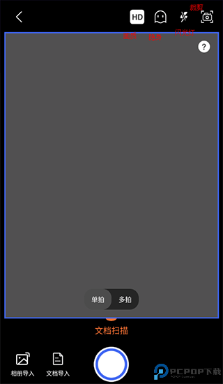 3、小编以“文档扫描”为例,进入后右上角可以调整画质像素、闪光灯以及裁剪比例等;