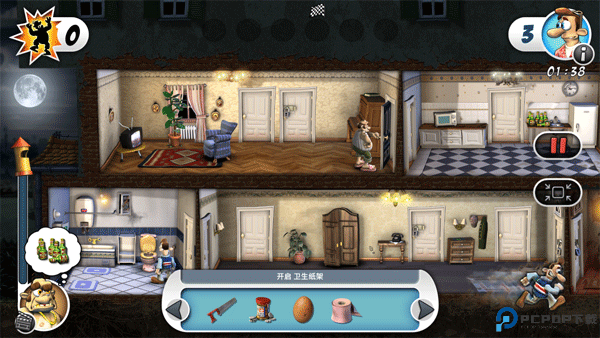 收集道具阶段:开头动画伍迪一进门,立刻在柜子里拿到保险丝,弹珠,然后马上上2楼的厨房,从厨房的垃圾桶里得到电缆(白色的),这个时候邻居上3楼了,不管他,立刻从厨房到地下室,先在工具台上拿到钳子(绿白那个),再到中间打开热气阀,再往右关闭水闸,立刻上楼躲到衣柜里面。上述动作请在45秒内完成,不然时间不够;