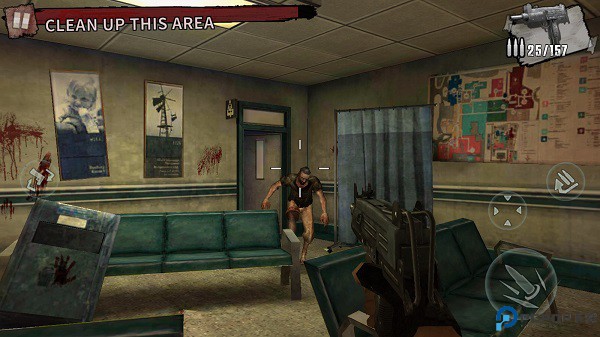 游戏操作还是比较符合大众玩家需求的,采用全屏触控来控制瞄准方向,在右下角有射击按钮、切换弹夹以及瞄准按钮,玩家们可以较为轻松的控制。本作中主角是固定不动的,我们只能控制视角的移动以及瞄准和射击,这种战斗方式虽然无法与《城市战争》这种超自由度的射击作品相比,但是就操作而言,这种固定的方式反而更强容易控制。
