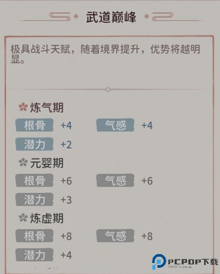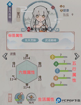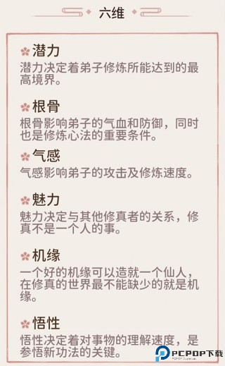 ③资质:气感影响攻击、根骨影响血防。(即便是一两点的差距,结丹后也会直接暴露无遗,所以前期六边形战士的气感和根骨必须足够优秀,通俗点说你招弟子得欧一点)