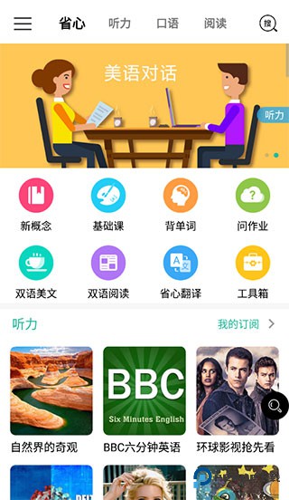 1、安装省心英语 App 后启动进入主界面,顶部功能区包含基础课、背单词和省心翻译等核心服务入口。