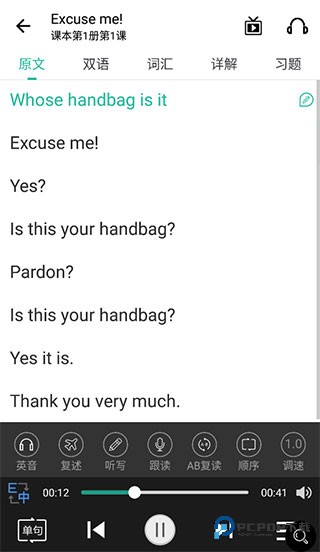 6、课程页面提供原文 / 双语模式切换按钮,底部控制栏设有复述、听写、调速三功能键用于学习适配。