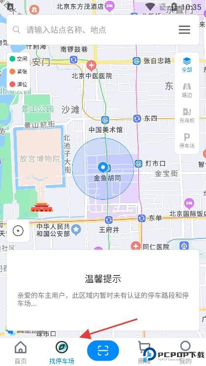 3、在找停车场地图界面,查看当前定位区域停车资源,搜索站点名称等查询目标停车场。