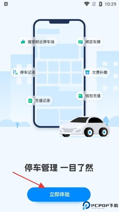 1、进入App引导页,点击立即体验按钮,跳转至主界面,开始使用停车管理相关功能。