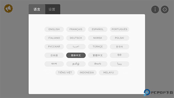 1、进入游戏界面后,游戏内置简体中文,玩家可在主菜单右上角的齿轮中的语言选项进行选择;