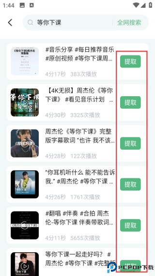 2、在搜索结果列表,选择目标视频,点击右侧【提取】按钮。