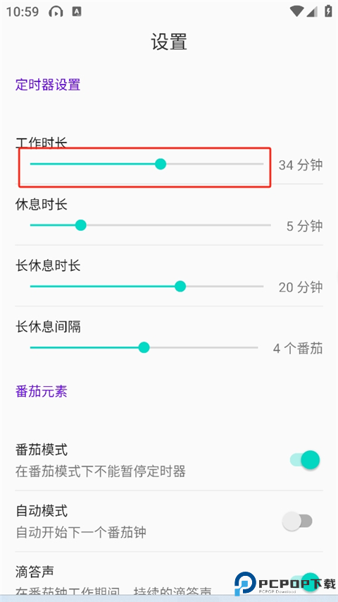 3、在工作时长左右划动,选择你想要设置时长,也可以选择休息时间。