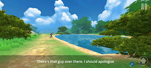 4、继续向前,在湖边发现了他,继续上前准备给他道歉。