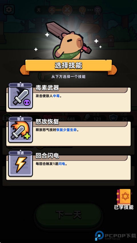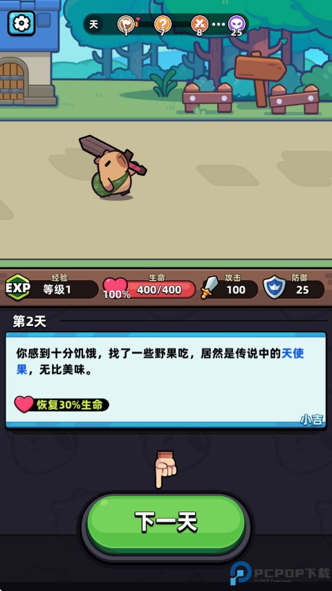 1、进入卡皮巴拉go最新版本游戏后玩家就能看到一只休闲的卡皮巴拉,我们可以点击下一天来触发事件。