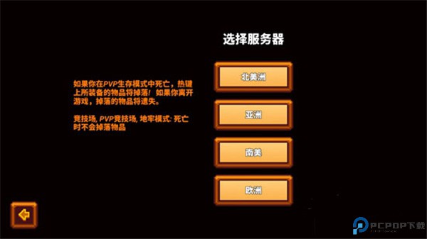 5、选择好自己的存档后,就会进入多人联机菜单,在这里我们可以点击左上角的箭头来选择不同的模式,包括生存模式、PVP竞技场模式、竞技场模式、地牢模式等。