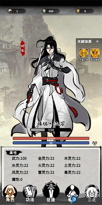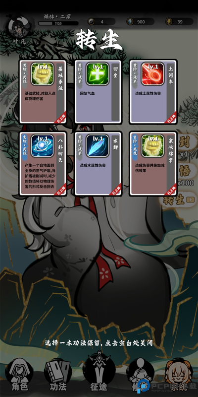 有了这6个技能就可以去打怪了,每打完一场就抽天赋和技能。每次打不过怪了,就先抽技能再打,打不过点一下修炼。每次打不过就是这样重复。换一下技能的上场,抽技能升级,最后迫不得已才是点修练点。