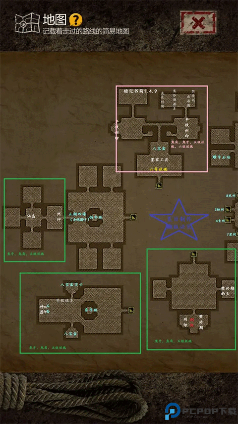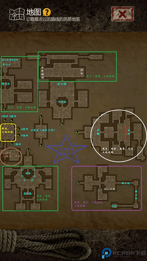 全图只要按照房间顺序走就不会卡关,我已经标记了房间序号,其中只有雕字石块和华字珠是要先去下一个房间拿到后再回头开。【每个州的房间里一定有州印,州印的位置都在图中标识清楚了,大家可以看到】PS:推荐在主厅刷够材料升几个三星人物,在此之前看到盾兵就跑,打不过,别硬刚。