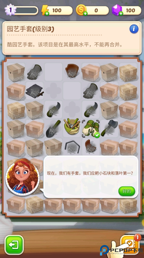 3、第一个任务是合并一个级别3的园艺手套,然后点击右下角。