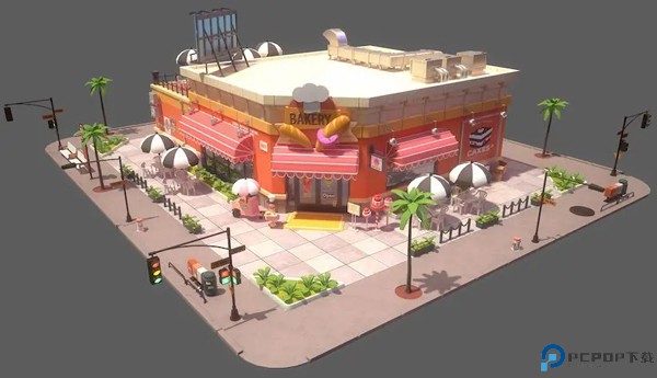 2、建议店铺位于城市中央,采用双层楼设计,周围铺设不知名石砖。