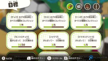 目标就是类似任务的东西,可以通过收集到一定数量的虫子、到达恐龙对战的成绩来完成。其中,有些诸如“收集全部鱼类”、“收集三十个菜粉蝶(モンシロチョウ)”等任务是必须从游戏开始阶段就进行的,所以要在游玩的同时,捕捉任务要求的全部虫子和鱼类。