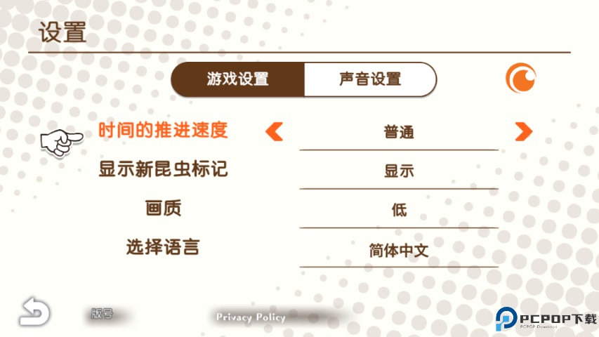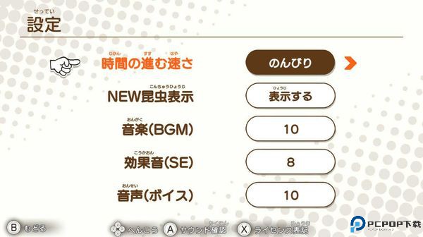游戏中时间的推进速度有悠闲(のんびり)、普通(ふつう)、快速(あっという間)三种可选。建议选择悠闲(のんびり),因为这样探索地图的时间会增多,收集虫子和鱼类的时间也更长。因此,建议在第一次通关的时候,设定为悠闲。时间设定的方法:是Y(菜单)→X(设定)→时间的速度