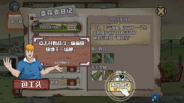 1、从本站下载并安装建筑工大战僵尸,打开进入根据页面文字点击任意位置,开始游戏。