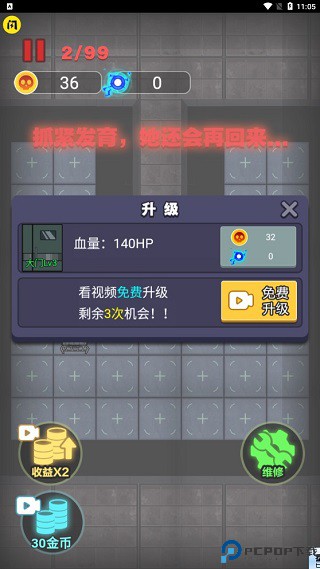 然后第一时间把床的每跳收益升级到+32,此时4个炮塔完全足够守住鬼的攻击。