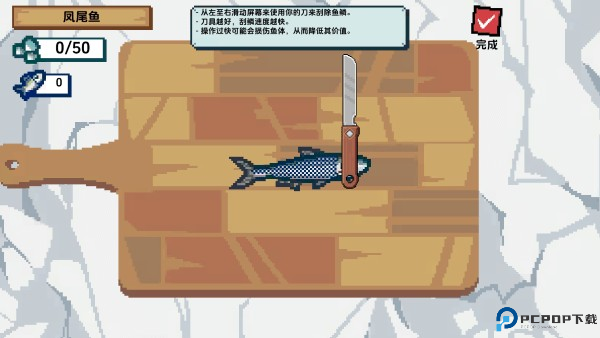 4、从左到右滑动屏幕来使用你的刀刮鱼鳞。道具越好,刮的越快,同时也不会伤了鱼体,价值也会越高。