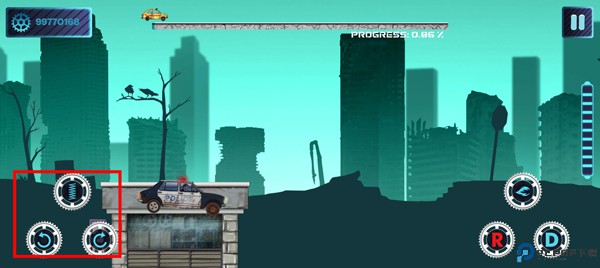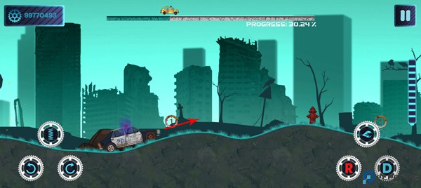 2、进入游戏之后,利用屏幕上的按键控制车辆前进,左下角的按键分别是车辆的跳跃,翘头和翘尾按钮,都是用来控制车辆防止翻车的;