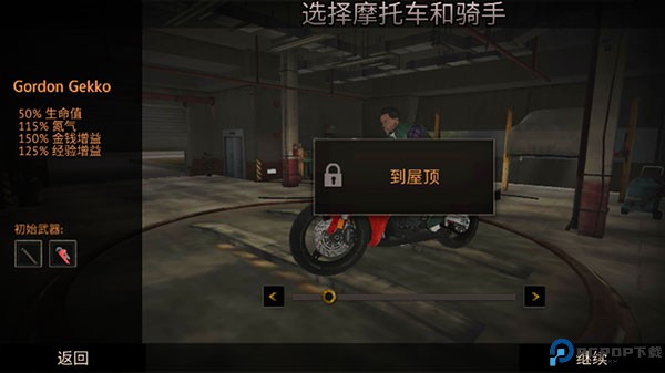 6、然后选择骑手,不同骑手的生命值和能够带来的增益都不同,越强的骑手需要完成越难的成就来解锁,例如图示的骑手,需要在关卡内将摩托开到屋顶才可以解锁。