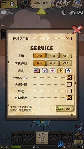 ③自动导航:一共3级,分别对应三个效果,1自动导航到高级区域boss,按开图顺序倒序寻找怪物刷新点,仓库满自动回港口,2自动导航到最近的怪物刷新点,3自动导航到活动地点。