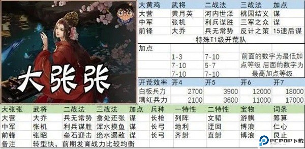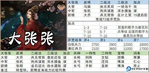 今年3月起,开始流行一支攻守兼备的队伍,大张张,优点数不胜数,但单以开荒角度来说,吃红,战法经验需求多,都是无法避免的缺点,因此我将其排到了