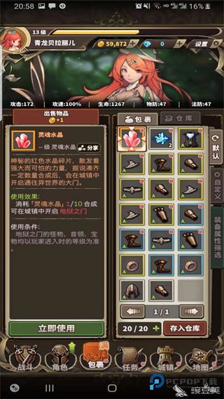 获取的物品可在背包中查看。装备点击后选择“穿戴”即可使用。金币可用于学习或升级技能,在技能界面选择目标技能消耗金币即可学习。