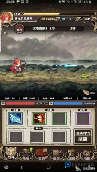 点击右下角地图图标进入关卡选择界面。选定关卡后直接进入战斗,战斗为自动进行。主界面下方显示当前可用的技能图标。