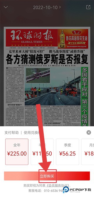 1、环球时报订阅界面展示当期报纸封面及重要新闻标题。用户可选择全年订阅等不同周期方案,确认后点击立即购买按钮完成付费订阅流程。