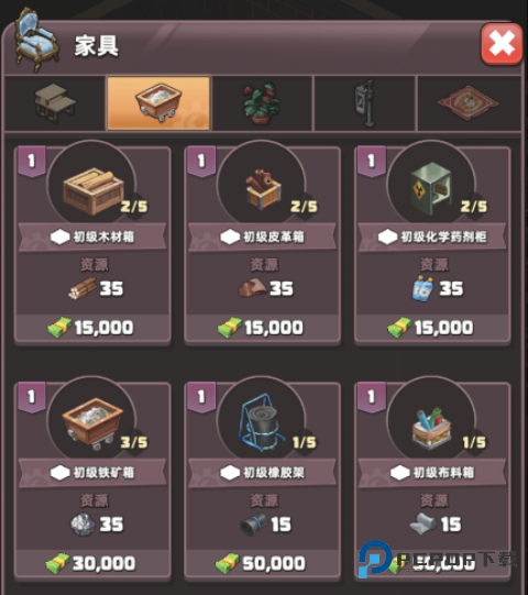 5、店铺资源箱配置建议:4 种货架各摆放 1 个;铁、木、皮、化学资源箱各摆放 3 个。