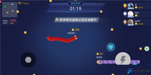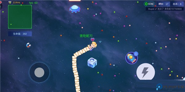 1.控制摇杆走位你的小蛇,吃掉地图上彩色的小圆点,就会变长。