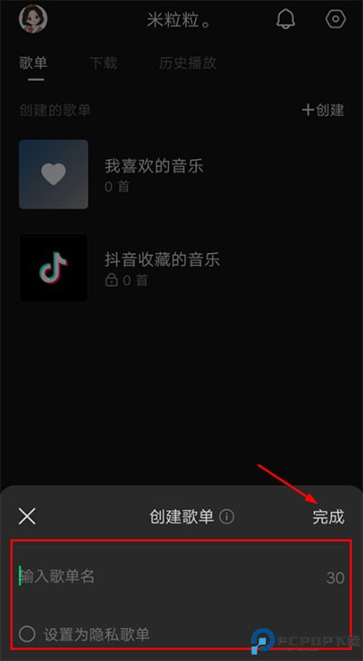 3、弹出窗口,输入歌单名称后,点击“完成”即可。