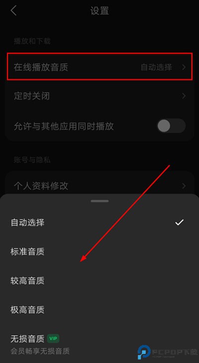 2、在【设置】页面,点击“在线播放音质”就可修改播放音质,用户可自行选择:标准、较高、极高、无损。