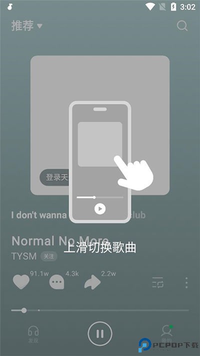 2、音乐的切换则是和抖音短视频一样,采用手动上下滑屏的方式,这也是目前视频音乐App主要的歌曲切换方式。