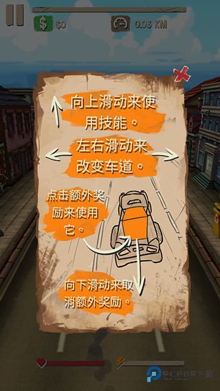 3、游戏中横向滑动屏幕移动车道,看到障碍物时上划手指释放特技